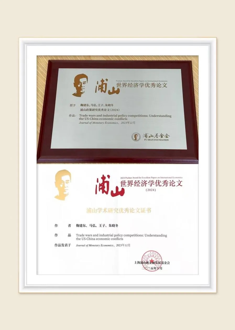 2025年10月24日,清华大学鞠建东教授与马弘教授(清华大学)、王子副教授(香港浸会大学)、朱晓冬教授(香港大学)合作发表的论文“Trade Wars and Industrial Policy Competition: Understanding the US-China Economic Conflicts”(贸易战与产业政策竞争:理解中美经贸冲突)获得“浦山政策研究优秀论文奖(2024年度)”。该论文于2024年在著名国际期刊 Journal of Monetary Economics发表。